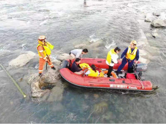 救援人员到达现场后,发现共有3男5女被困河中,其中2名女游客出现体力不支现象。消防救援大队1名专业舟艇驾驶员和2名专业水域救援队员带上救生衣、保险绳等救援设备前往河中实施救援。