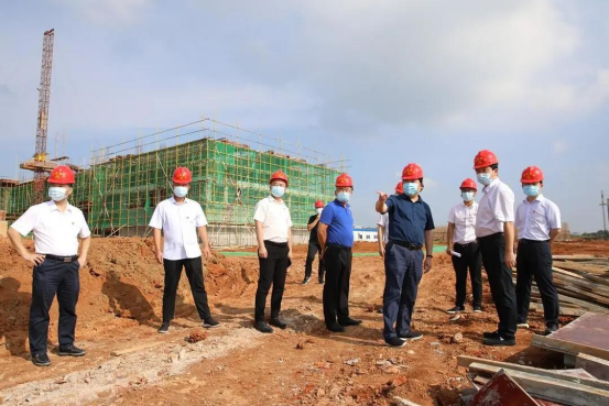 在湖南应急救援益阳中心项目建设现场,熊炜一行边走边看,边了解项目建设推进情况。