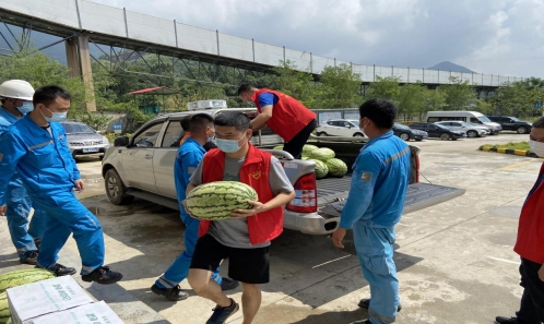 8月6日上午,炎炎夏日,骄阳似火,安化县应急管理局党委和机关工会开展“送清凉·战疫情·促安全”活动,慰问海螺矿区一线员工,送去60份防暑降温用品、1200只口罩、20件饮用水、500斤西瓜等物资,为保障一线工作人员生命安全和身心健康尽一份力。