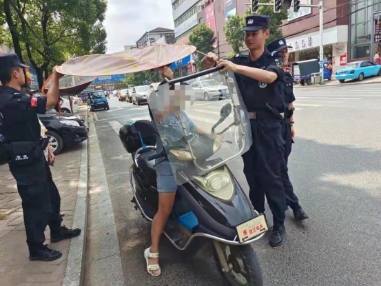 图为行政执法人员对电动车加装的晴雨伞进行拆卸