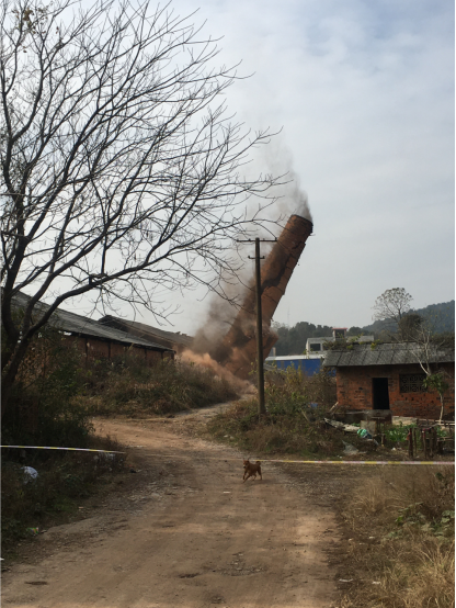 12月20日中午,随着施工号令的下发,破拆工程机械开始作业。经历半小时的时间,位于灰山港镇天子坡村原泉塘坳砖厂内部的烟囱轰然倒地,成功进行拆除。