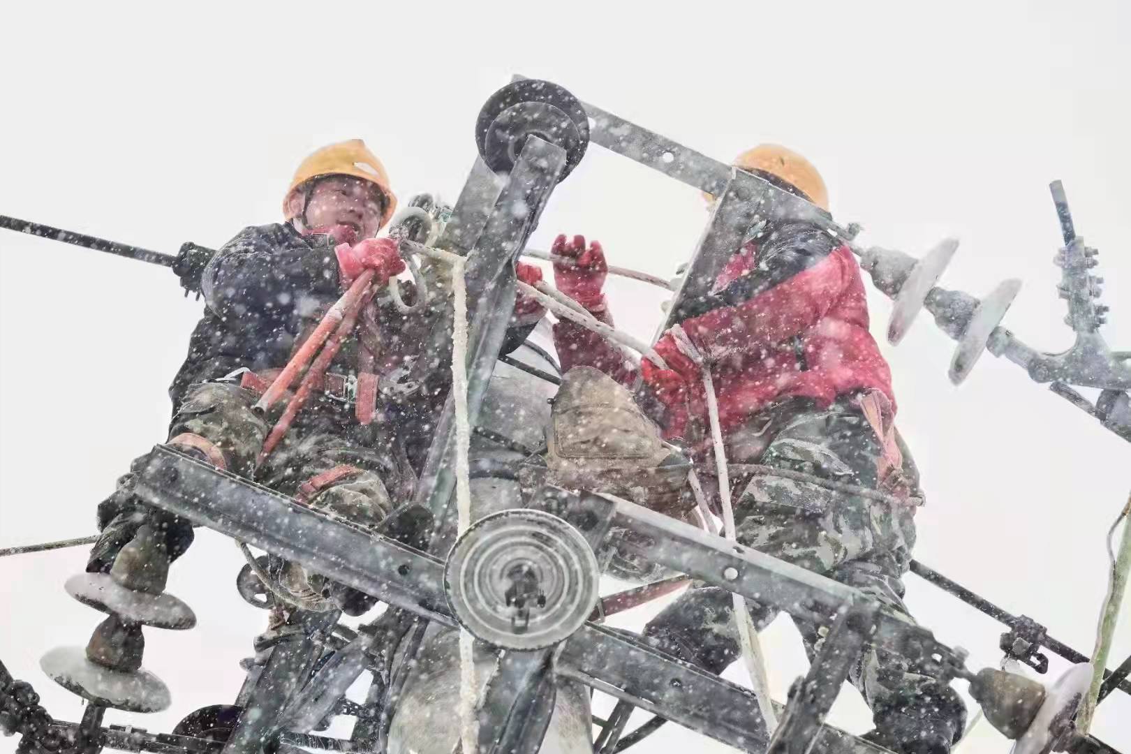 沧水铺镇沧砂线电力设施抢修现场,姚冠南副所长带领抢修人员与天灾展开了一场艰苦的拉锯战,杆立了又倒,倒了又立;线接了又断,断了又接,雪花吹的眼睛睁不开,手冻僵了……共产党员冲在前,党员突击队的红旗特别耀眼。