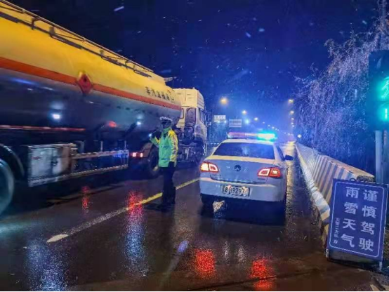 交警在易结冰路段连夜巡逻,及时处理突发情况;