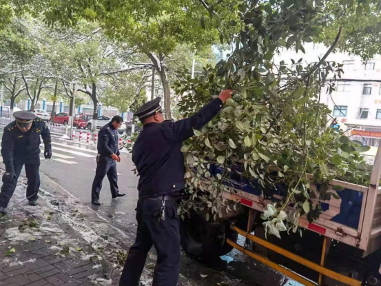 城市管理人员积极除雪,清理道路这段树枝,为群众出行保驾护航。