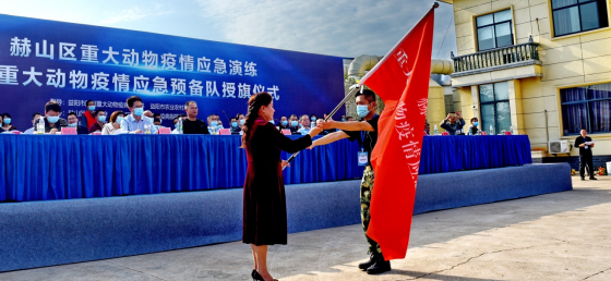 授旗仪式在雄壮的分列式进行曲中拉开帷幕,由区畜牧水产事务中心、区农业综合执法大队、区诚铸无害化处理中心、笔架山乡人民政府及区应急救援协会60人组成的封锁隔离分队、扑杀消杀分队、流调监测分队、紧急免疫分队、无害化处理分队、综合保障分队依次入场,队员们精神饱满,斗志昂扬,行动敏捷,展现了听从指挥,纪律严明的军事化管理风格,体现了赫山重大动物疫情应急能力建设的新气象。副区长蔡丽环为赫山区重大动物疫情应急预备队授旗。