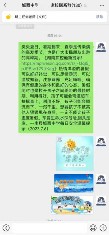 “今天的安全提醒已送到,请各位家长查收!”假期虽已开始,但南县城西中学各班的“每日安全提醒”依旧每天准时送到了家长手中。这既是该校已持续近两年的一项工作,也是对于假期安全工作的认真落实。学校、老师、家长齐发力,筑牢暑期安全“堤坝”,共度快乐一“夏”。