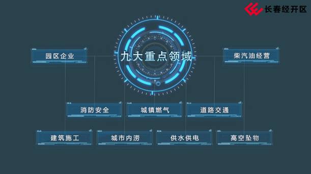 长春经开区根据上级精神,结合自身实际情况,会同相关部门、聘请专家参与,多次开会研究,确定了九大重点领域:园区企业、柴汽油经营、消防安全、城镇燃气、道路交通、建筑施工、城市内涝、供水供电及高空坠物。