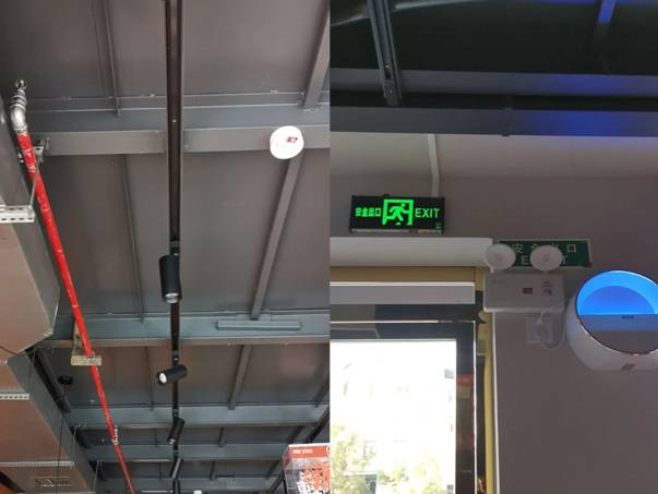 整改后按要求设置喷头、感烟探头和应急照明灯