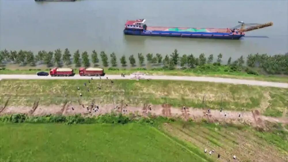 为了及时应对可能出现的险情,当地还采用了“以车代仓”“以船代仓”的方式储备防汛物资,记者在现场看到数辆装载着砂石的卡车停在堤上,一辆装载着砂石的货轮停在堤坝边。