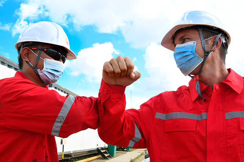 2020年11月27日,中国石油集团长城钻探工程公司古巴项目GW91钻井平台中方员工(左)同古方员工互相致意。新华社发(华金·埃尔南德斯 摄)