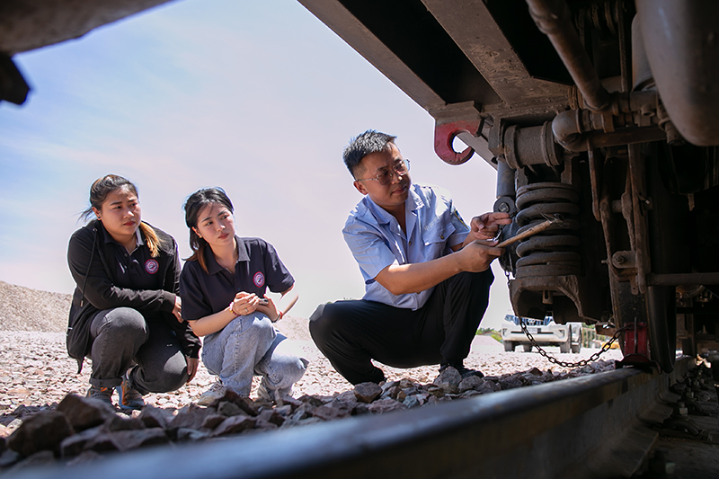2021年9月12日,在老挝首都万象北郊的中国中铁二局中老铁路铺轨基地,希达·平蓬莎万(中)跟着中国师傅(右)检查列车。新华社发(凯乔 摄)