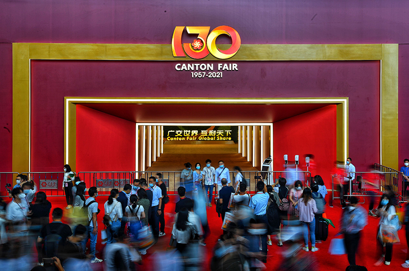 参展人员在广州举行的第130届中国进出口商品交易会(广交会)现场(2021年10月15日摄)。新华社记者 刘大伟 摄