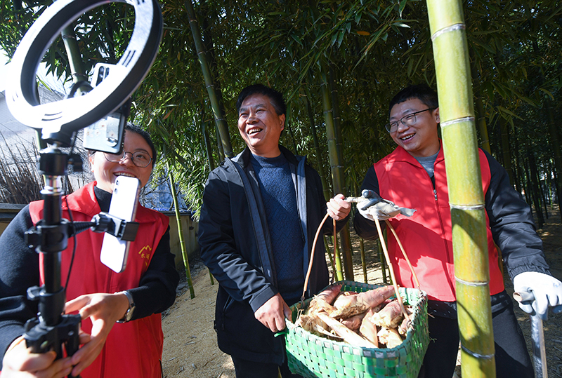 浙江省杭州市临安区太湖源镇党员志愿者和种植户在竹林直播采收雷笋,助力线上销售(2021年12月23日摄)。新华社记者 徐昱 摄