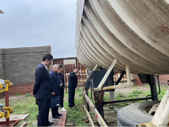 4月4日,益阳市应急管理局工贸科成员前往欧江岔镇益阳市湘陶建筑材料有限公司核实群众举报相关事宜。日前,市应急局接到群众举报投诉,反映“某建筑材料有限公司在使用LNG环节上不符合安全要求,现场使用LNG槽车尾挂供气,气站设在路边,不符合安全距离要求,不知道是否有安评手续,是否在有效期内;现场槽车尾挂是否手续齐全;气站内围堰、喷淋、消防等安全设施是否齐全”等情况,要求应急部门加强监管。