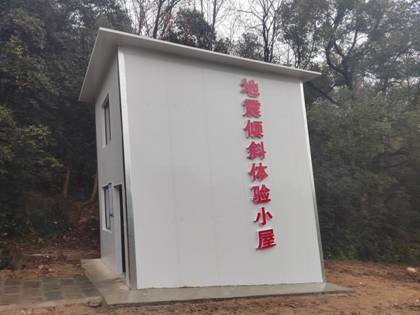 小屋模拟一间建筑结构被地震损坏的倾斜房间,房间正对的两面墙及内部地板均与地面成18度倾斜,参观者进入小屋时,马上会感觉整个人都斜了过来、行走困难,努力想保持平衡,身体却不听使唤。为什么人一进入倾斜小屋就站不稳了呢?原来,参观者进入小屋后,虽然脚踩在倾斜的地板上,视觉信息却还认为自己是站在水平地面上,由于视错觉和人体感受所产生的矛盾,马上会体验到震后在废墟环境中逃生会产生的失稳感、晕眩感等特殊感受。倾斜小屋的建成开放,将为我市新增一个感受地震、体验地震的窗口。