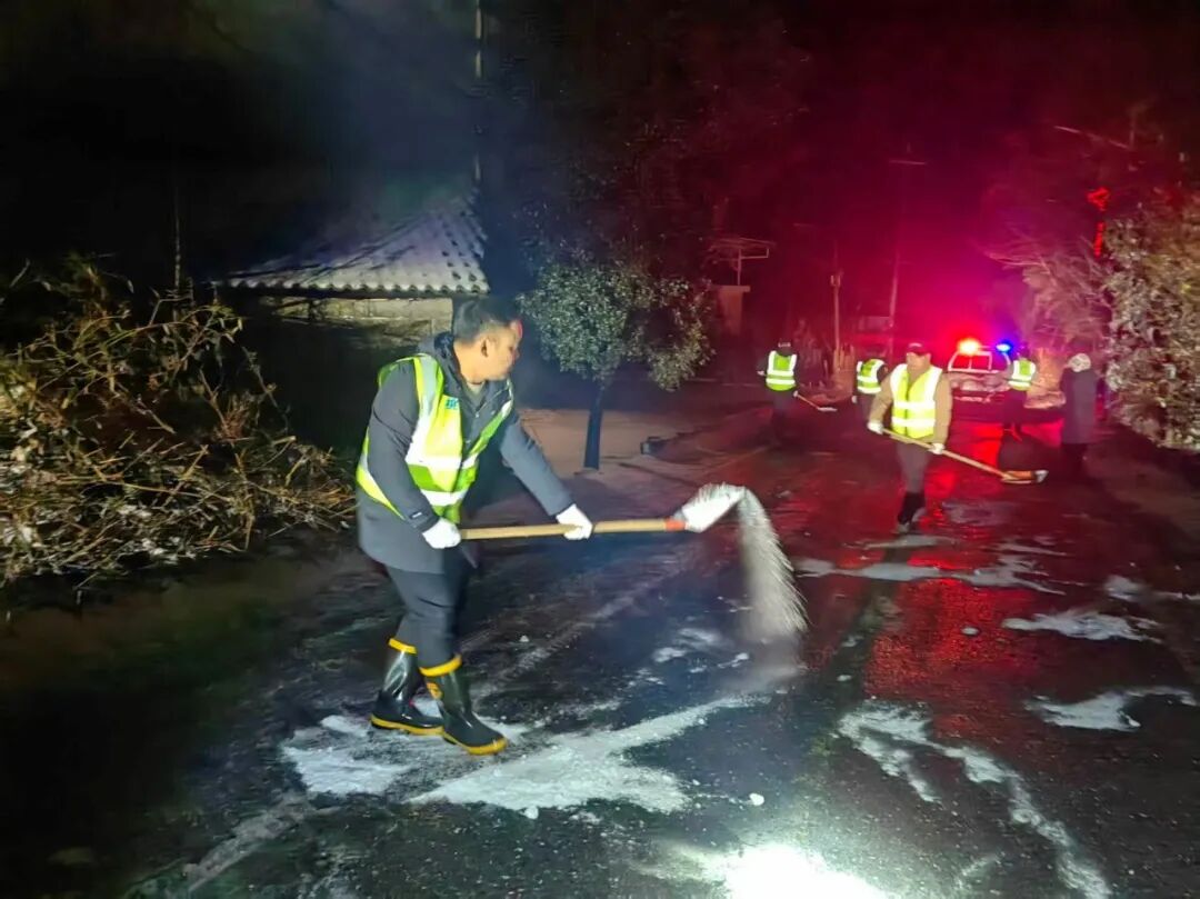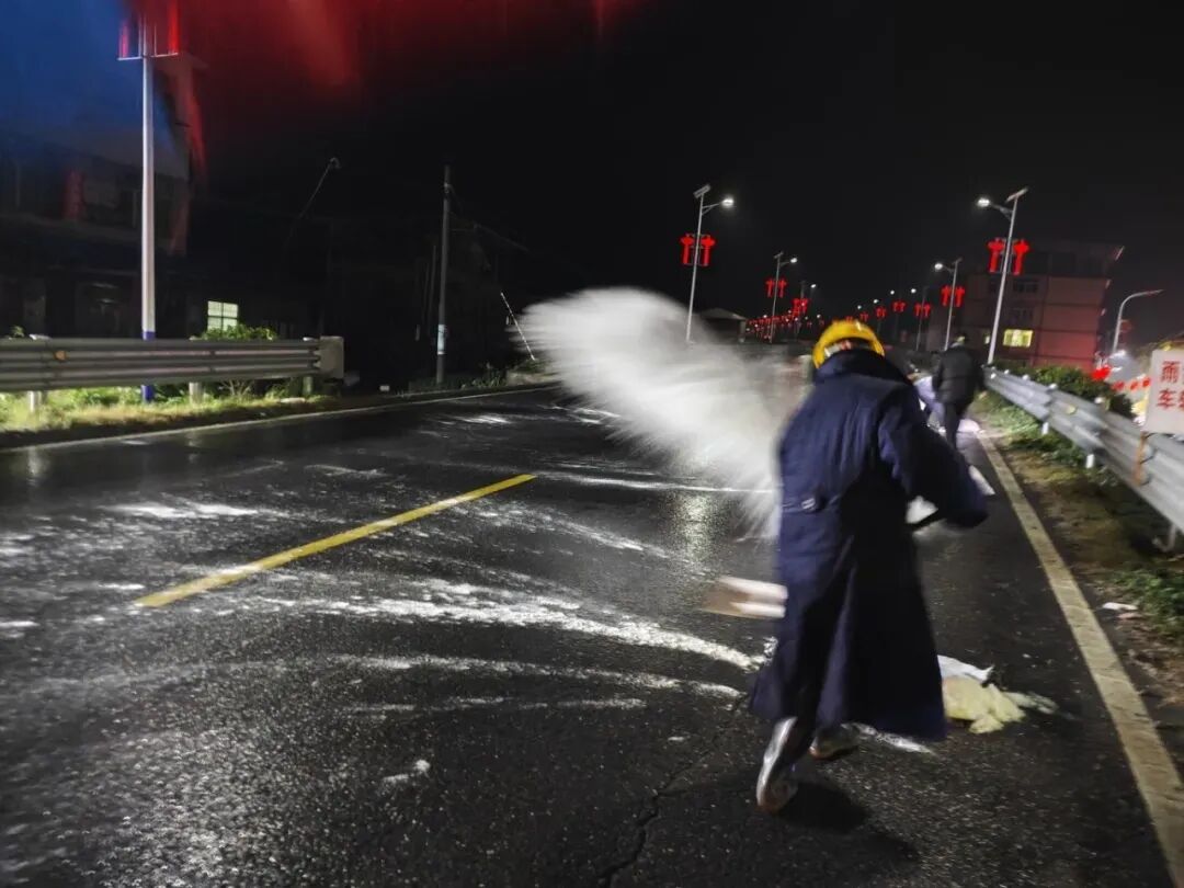 1月20日晚,三堂街镇政府主要负责人带领应急办工作人员对辖区重点路段进行撒盐除冰,筑牢道路安全防线,守护群众出行平安。