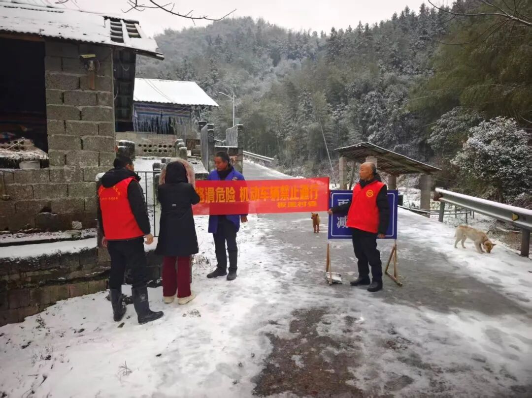 1月20日,鸬鹚渡镇组织干部、志愿者开展撒盐除冰工作,在危险路段设置禁行标识。