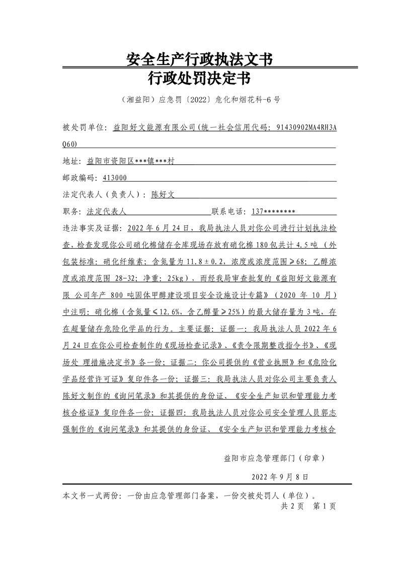 益阳市应急管理局行政处罚决定书公示 行政处罚决定书(湘益阳)应急罚〔2022〕危化和烟花科-6号