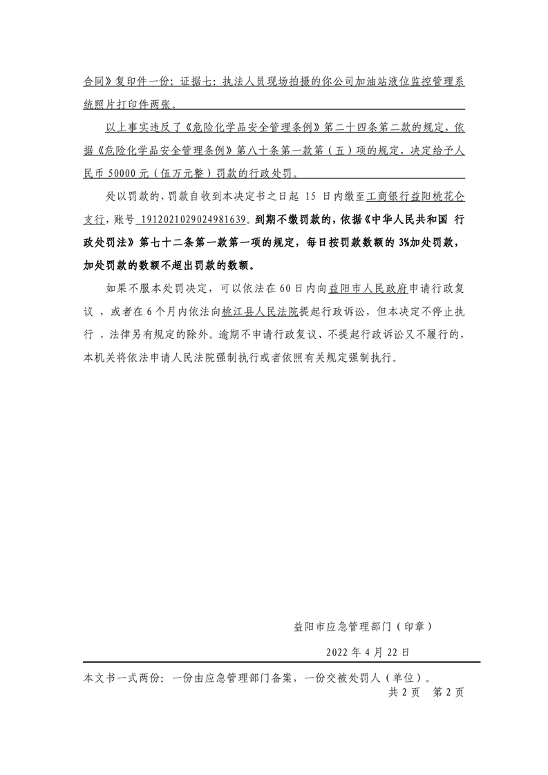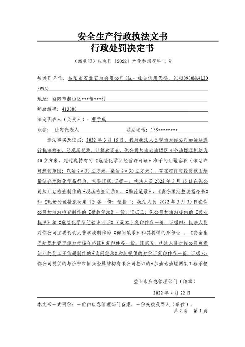 益阳市应急管理局行政处罚决定书公示 行政处罚决定书(湘益阳)应急罚〔2022〕危化和烟花科-1号