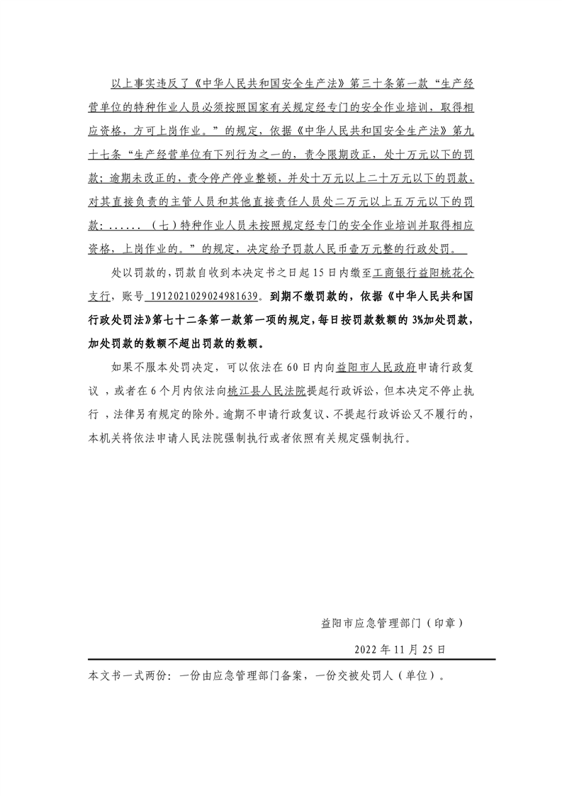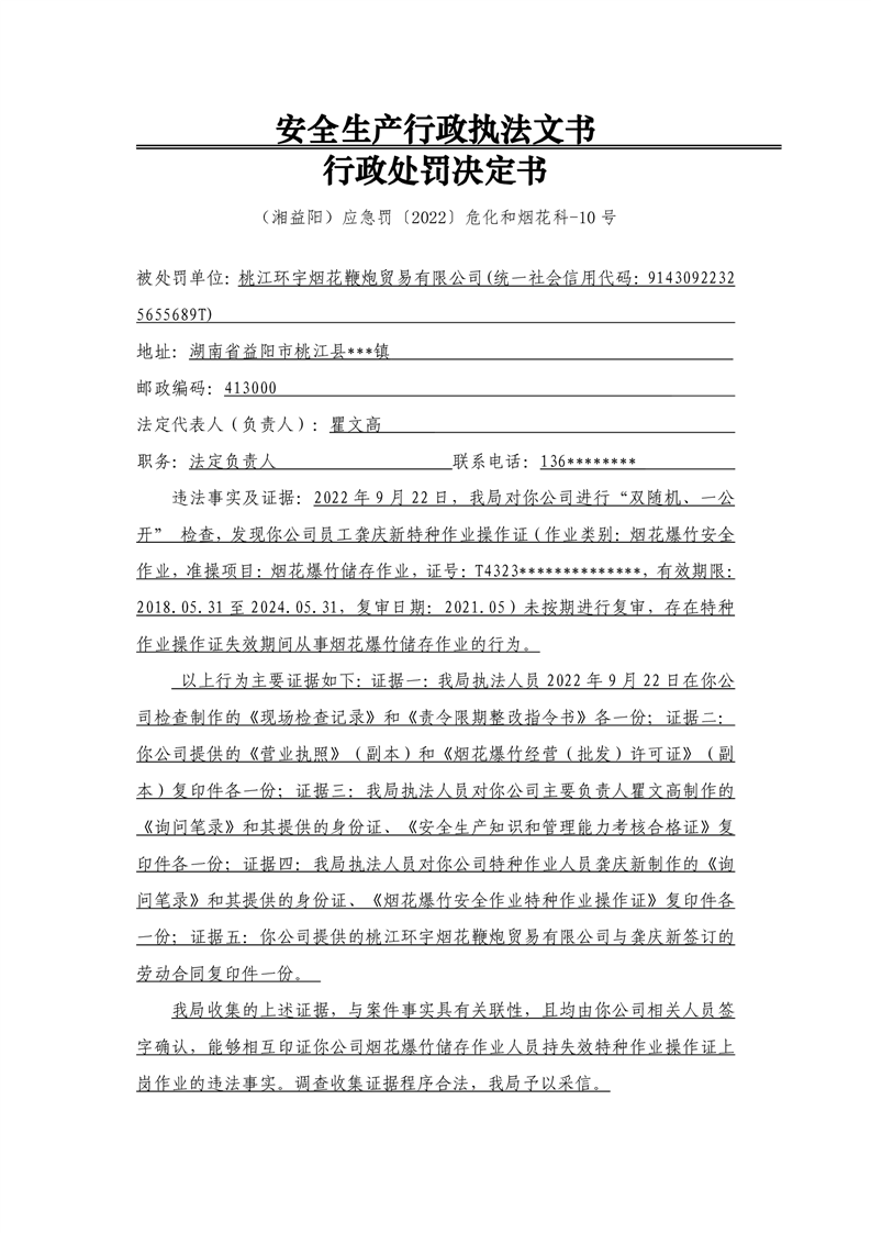 益阳市应急管理局行政处罚决定书公示 (湘益阳)应急罚〔2022〕危化和烟花科-10号