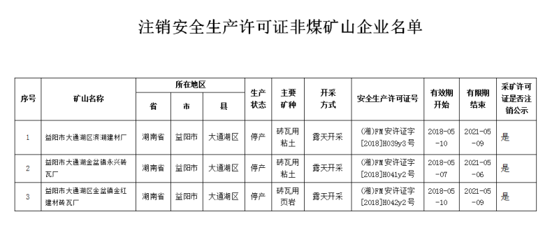 益阳市大通湖区滨湖建材厂等3家企业因关闭等原因,终止生产经营活动,依据《非煤矿矿山企业安全生产许可证实施办法》(原安监总局令 第20号)和湖南省应急管理厅《关于落实委托下放部分非煤矿山企业安全许可工作的通知》(湘应急函[2019]118号)的规定,决定注销其安全生产许可证。