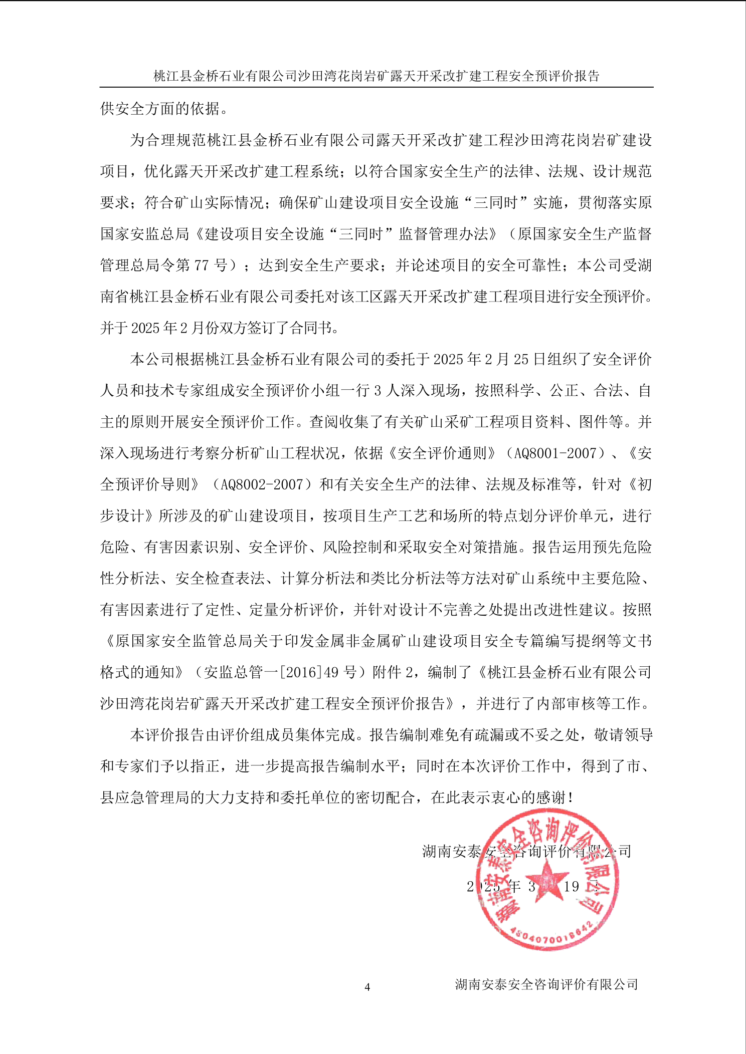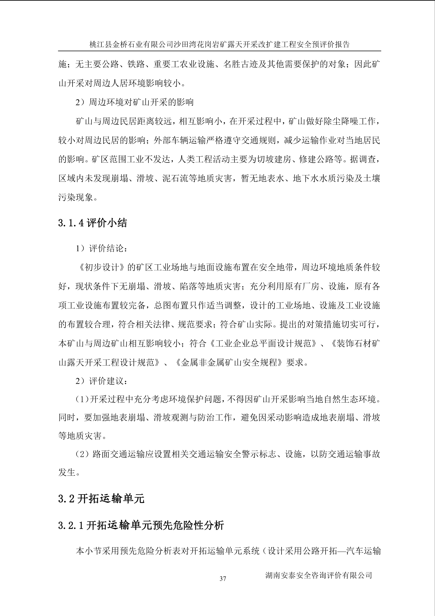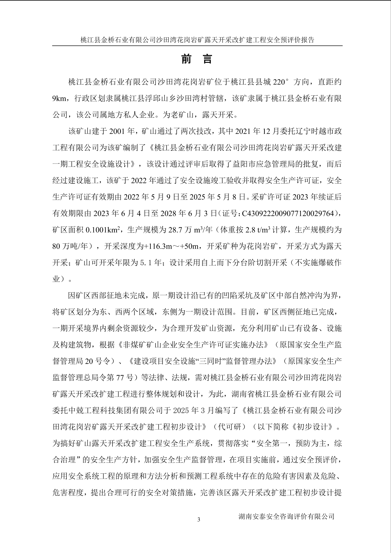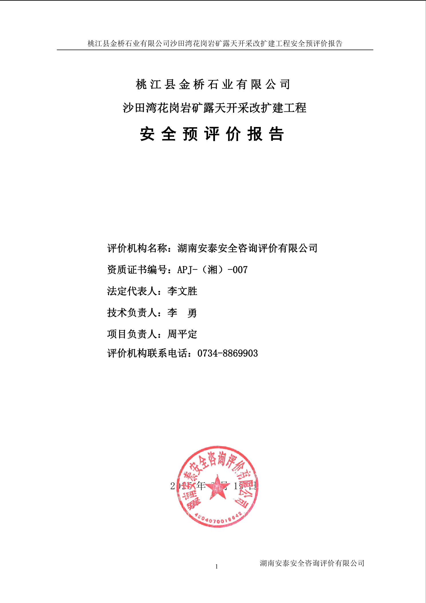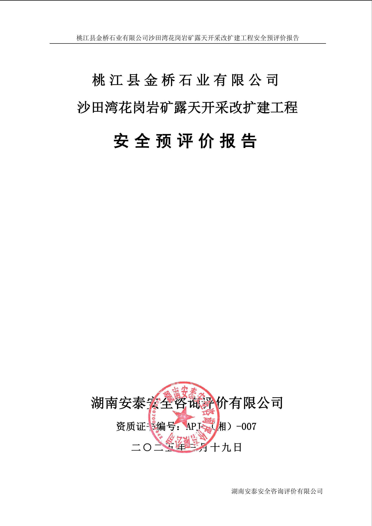 桃江县金桥石业有限公司沙田湾花岗岩矿改扩建工程安全预评价报告