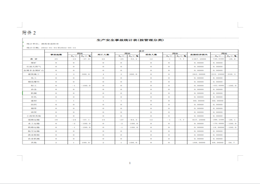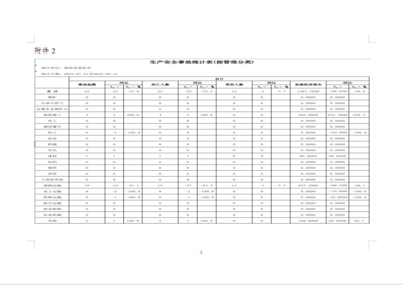1、赫山区:事故8起,死亡7人,受伤4人。其中道路运输事故5起、死亡4人、受伤4人;建筑施工事故2起、死亡2人;其他事故1起、死亡1人。与去年同比事故起数减少1起、下降11.1%,死亡人数减少2人、下降22.2%,受伤人数增加4人,上升400%。