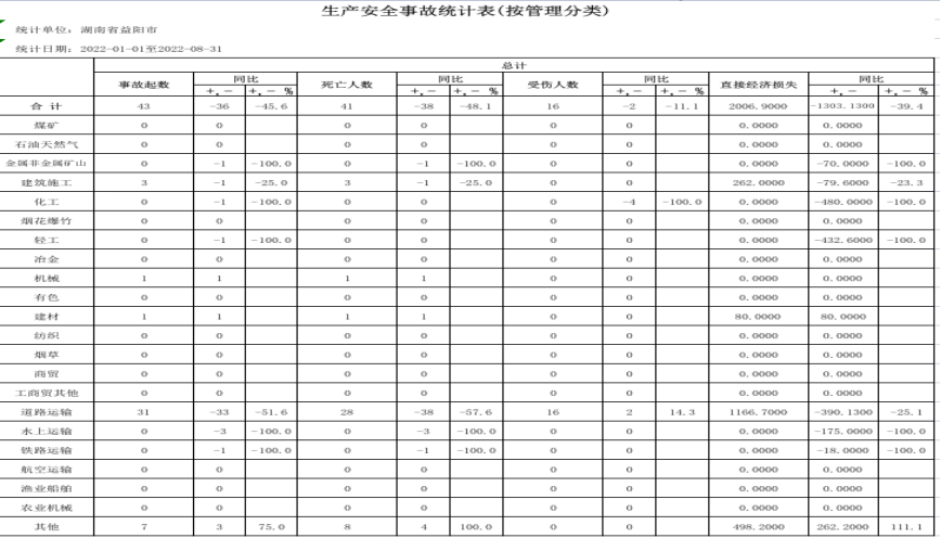1、赫山区:事故12起,死亡11人,受伤4人。其中道路运输事故8起、死亡7人、受伤4人;建筑施工事故2起、死亡2人;其他事故2起、死亡2人。与去年同比事故起数减少11起、下降47.8%,死亡人数减少12人、下降52.2%,受伤人数增加4人,去年同期无。