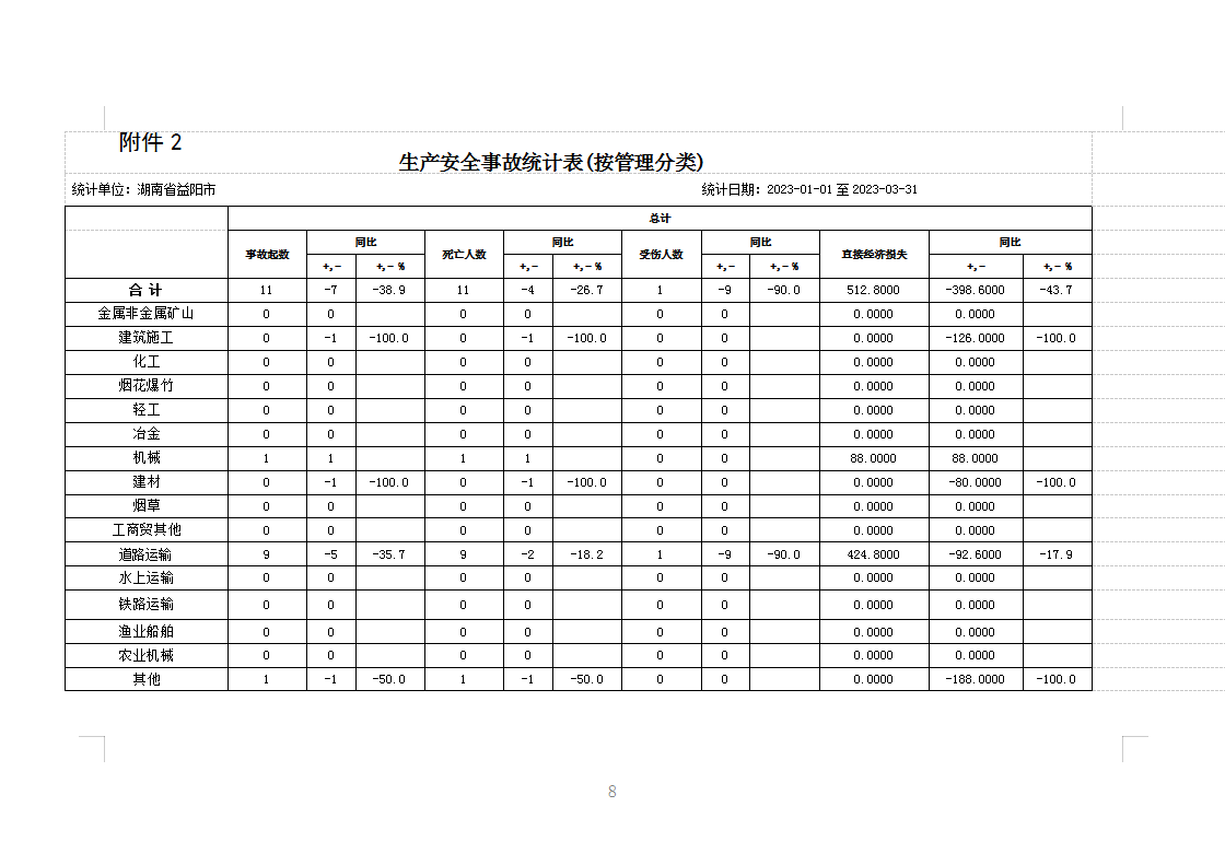 8.大通湖区:未报送事故。与去年同比事故起数减少1起、下降100%,死亡人数减少1人、下降100%。