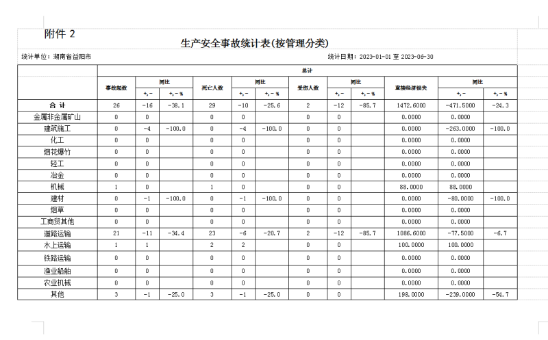 1.赫山区:事故2起(道路运输事故1起、机械伤害事故1起),死亡2人。与上年同比事故起减少12起、下降85.7%,死亡人数减少11人、下降84.6%,受伤人数减少4人、下降100%。