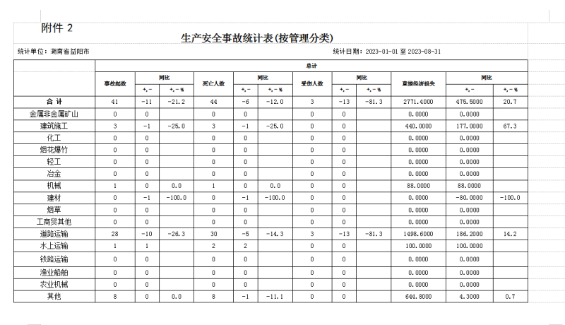 剔除道路运输事故后,1-8月,其他行业发生生产安全事故13起、死亡14人,与上年同比分别下降7.1%、6.7%。8月份,全市共发生生产安全事故7起,死亡7人、伤1人,与上年同比,事故起数增加5起、上升250%,死亡人数增加5人、上升250%。其中道路运输事故2起,死亡2人、伤1人,其他行业生产安全事故5起、亡5人,分别是:益阳市少年儿童体育学校“8·3”一般触电事故;安化县城南区职苑小区建设项目“8·9”一般事故;赫山区湖南工艺美术职业学“8·19”一般事故;桃江县万基旅游置业有限公司“8·19”一般事故;大通湖区千山红镇中心卫生院“8·22”一般事故。