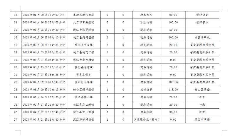 1-8月,接报较大非生产经营性交通事故2起,亡6人,伤1人。分别是:2月23日,益阳高新区“2·23”较大道路交通事故,亡3人;5月6日,桃江县鸬鹚渡镇“5·6”较大道路交通事故,亡3人、伤1人(该起事故中涉事营运车辆无责任)。