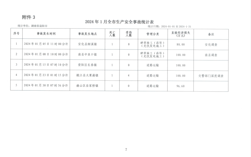 3.安化县:建筑施工(光伏发电施工)事故1起,死亡1人。与上年同比,事故起数减少1起、下降50%,死亡人数减少1人、下降50%。