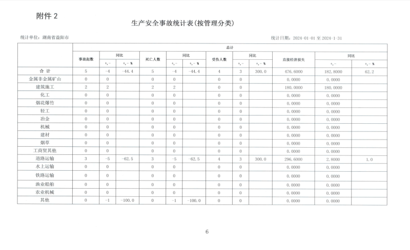 4.桃江县:道路运输事故1起,死亡1人,受伤4人。与上年同比,事故起数减少1起、下降50%,死亡人数减少1人、下降50%,受伤人数增加4人、上年同期无。