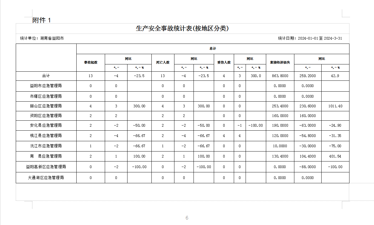 6.南 县:事故2起,死亡2人。其中道路运输事故1起,死亡1人;建筑施工(光伏发电施工)事故1起,死亡1人。与上年同期相比,事故起数增加1起、上升100%,死亡人数增加1人、上升100%。