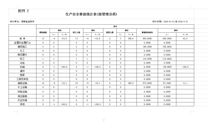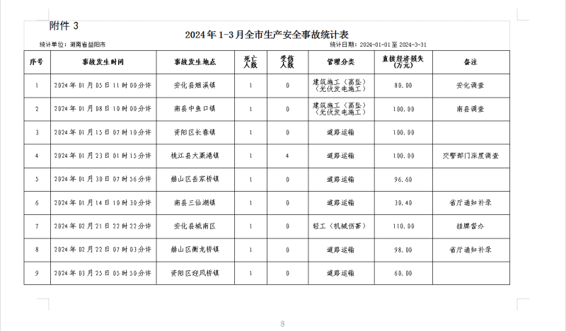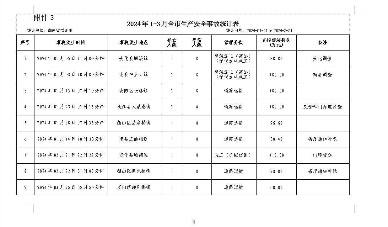 3.安化县:事故2起,死亡2人。其中建筑施工(光伏发电施工)事故1起,死亡1人;轻工(机械伤害)事故1起,死亡1人。与上年同期相比,事故起数减少2起、下降50%,死亡人数减少2人、下降50%。