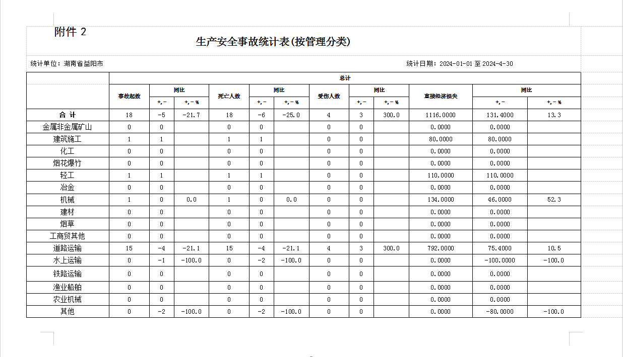 1.道路运输:按照应急管理部门统计口径的为15起,死亡15人,受伤4人。与上年同期相比,事故起数减少4起、下降21.1%,死亡人数减少4人、下降21.1%,受伤人数增加3人、上升300%。