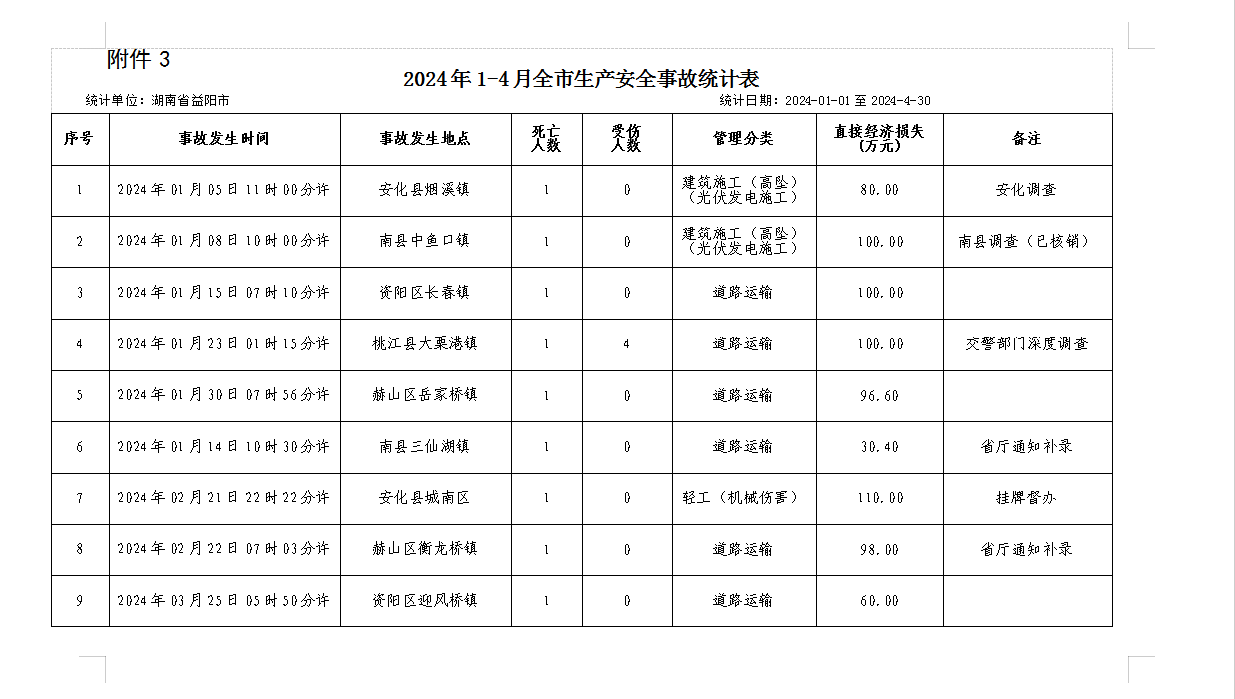 现将2024年1-4月份全市生产安全事故情况通报如下:
