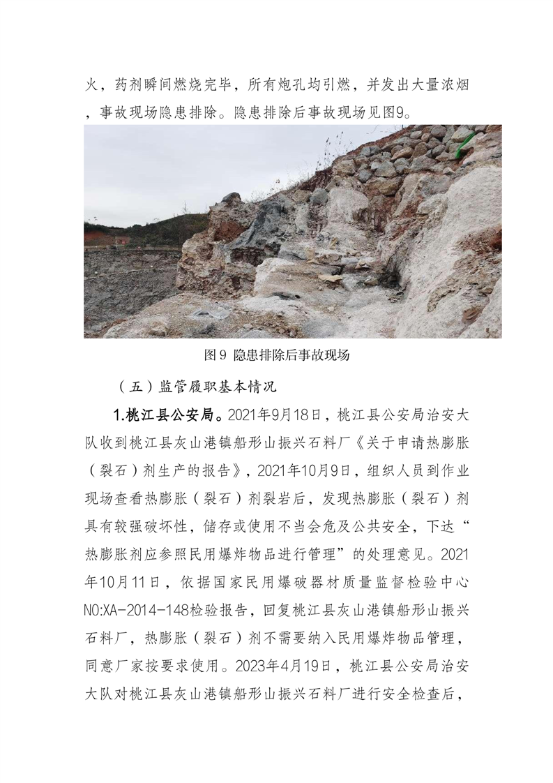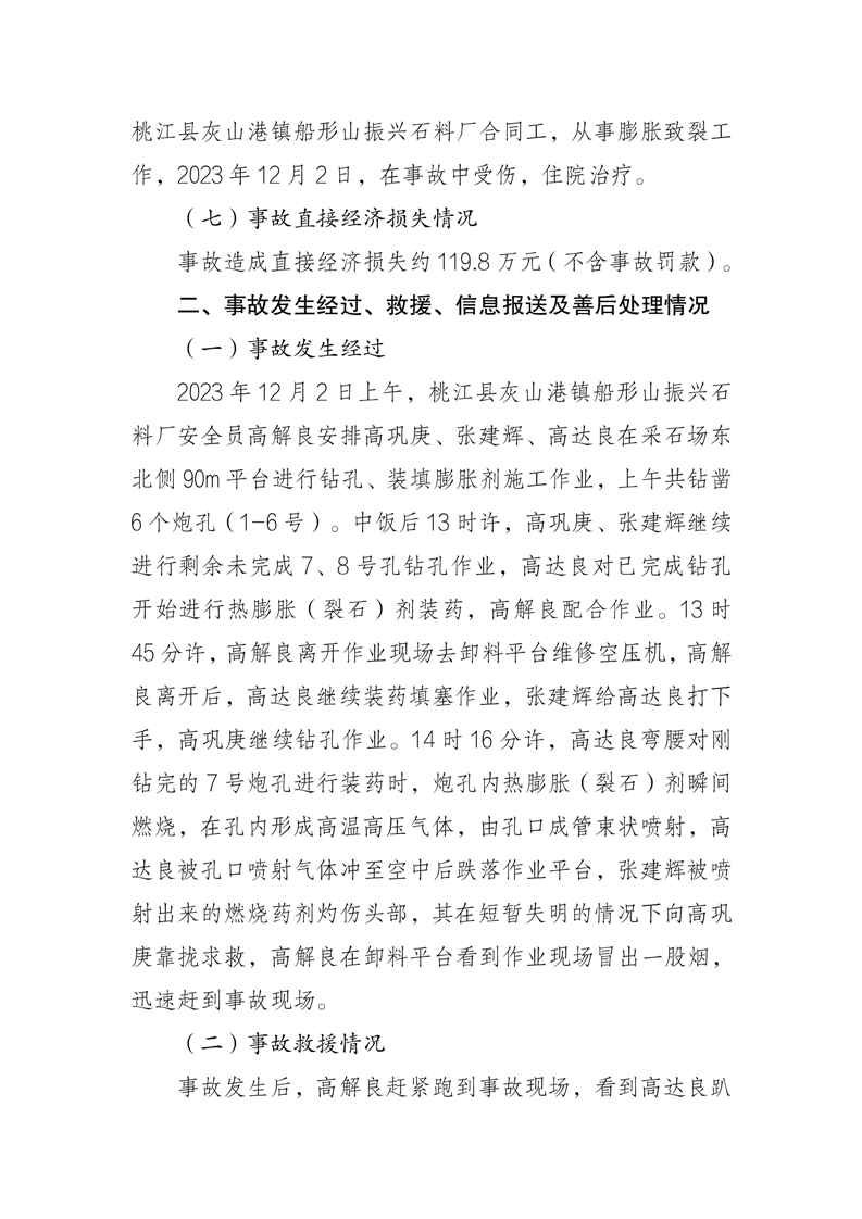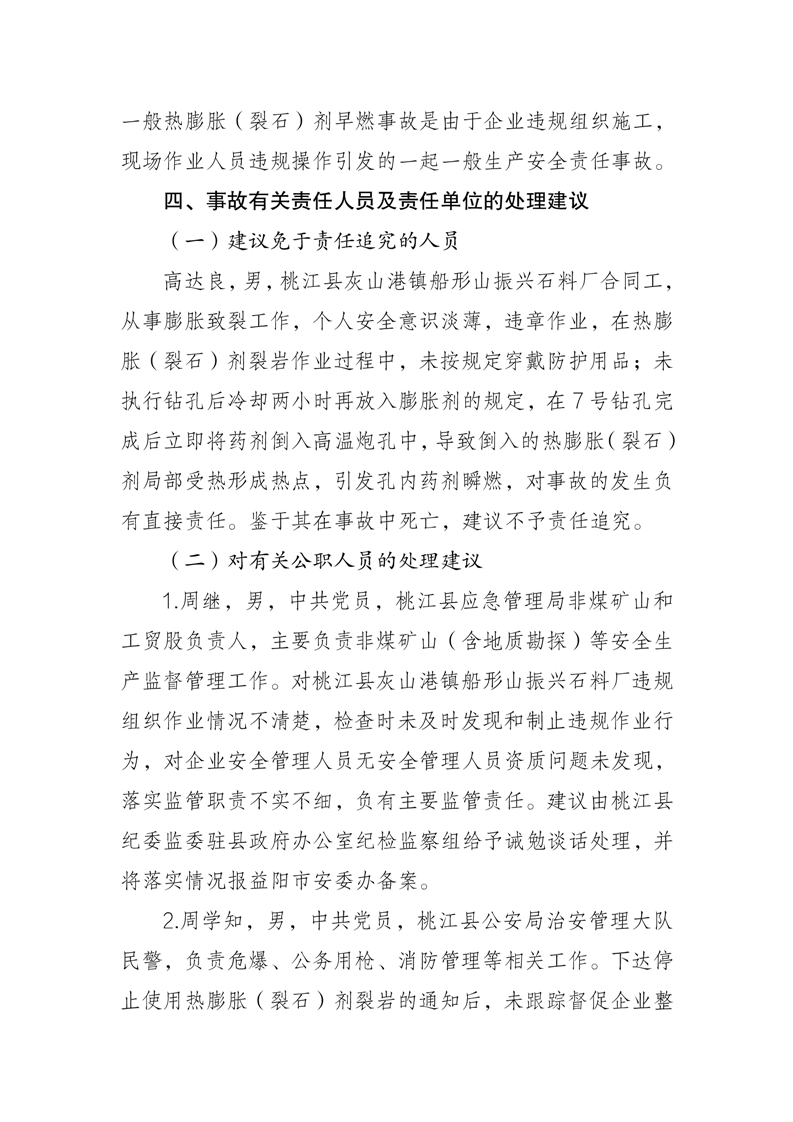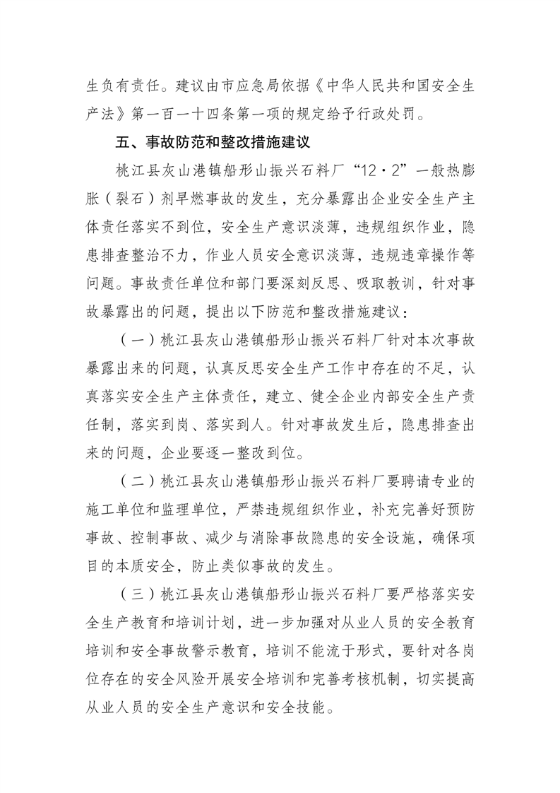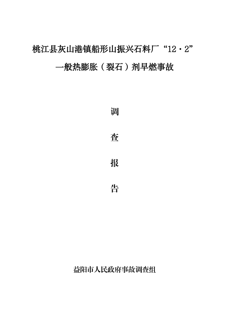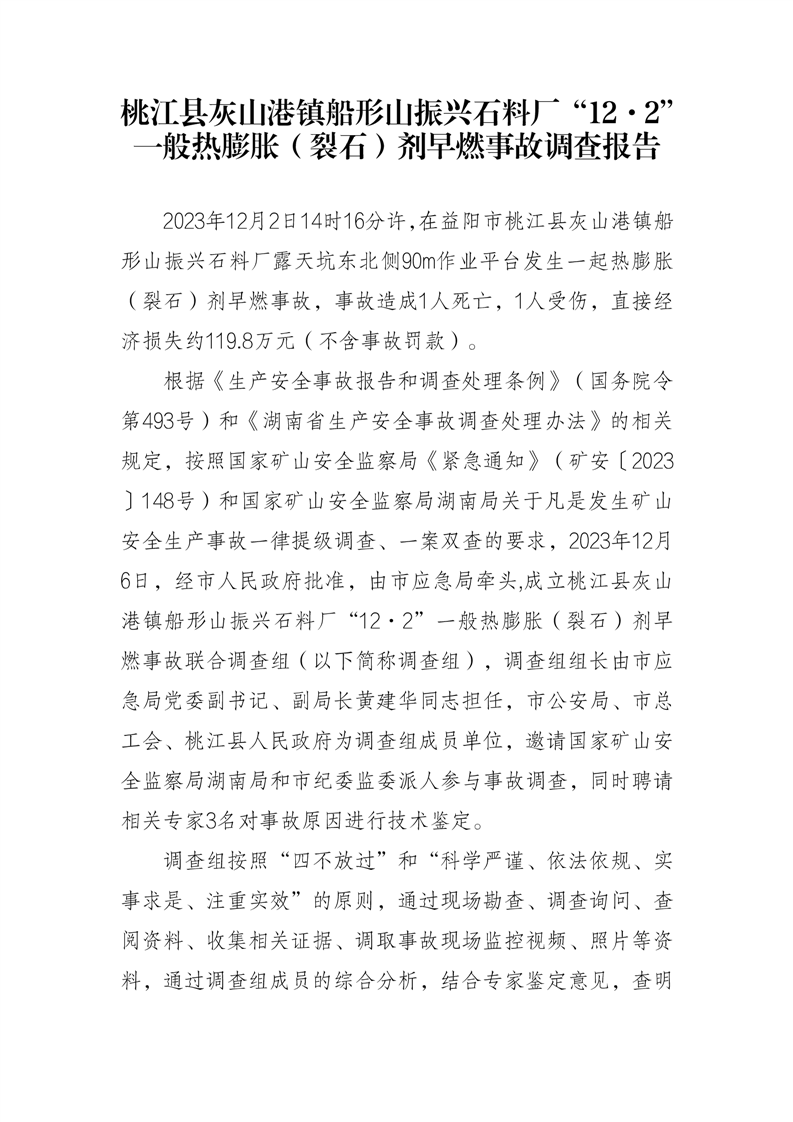 桃江县灰山港镇船形山振兴石料厂“12·2”一般热膨胀(裂石)剂早燃事故调查报告