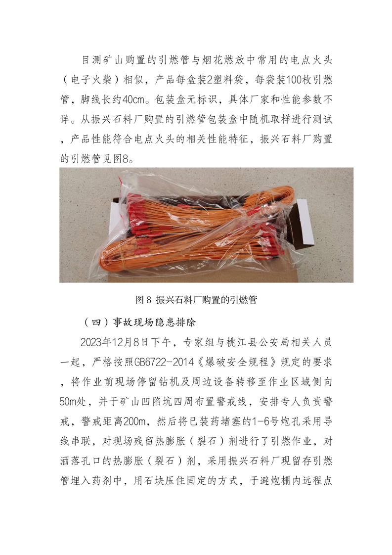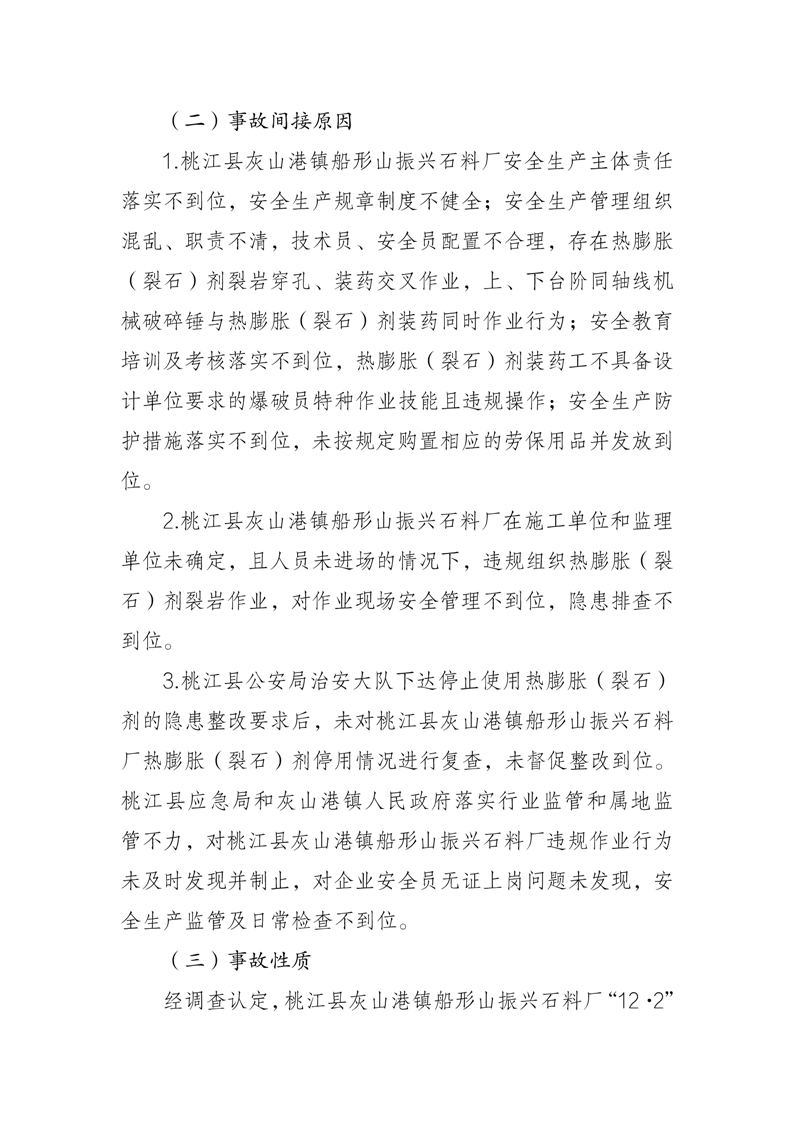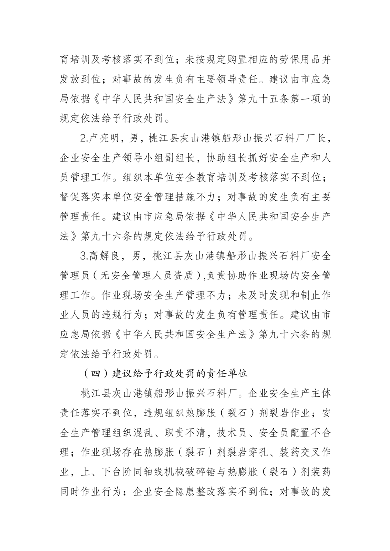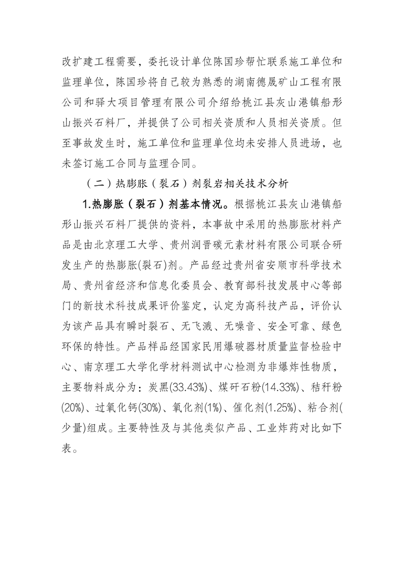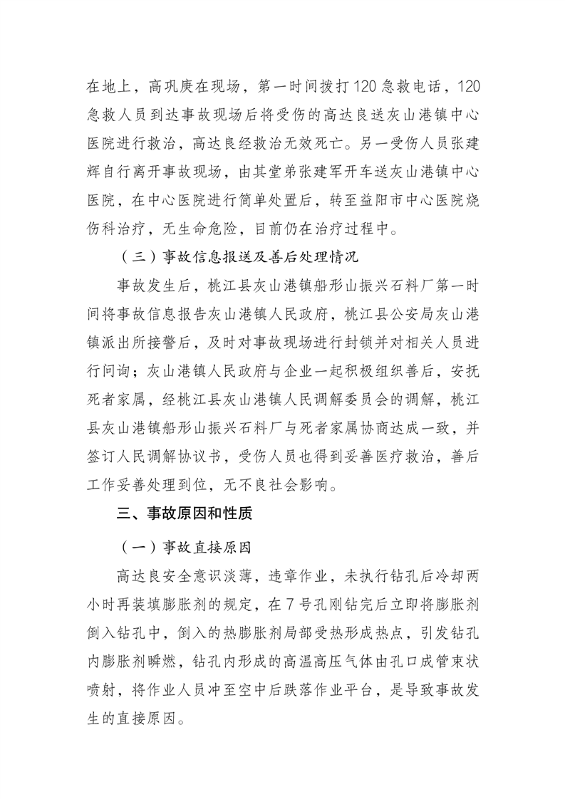 桃江县灰山港镇船形山振兴石料厂“12·2”一般热膨胀(裂石)剂早燃事故调查报告