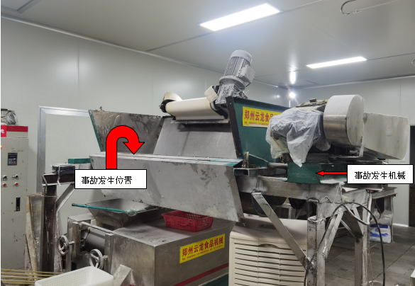 (五)事发设备情况:事发设备为郑州市云龙食品机械有限公司生产的145型熟化机,熟化机下方安装有一台郑州市云龙食品机械有限公司生产的复合压延机。熟化机料斗挡板张贴有“当心卷入”的安全警示标志以及喂料机安全操作规程。经现场勘察,熟化机存在对人体造成机械伤害的可能性,料斗却未设置相应的防卷入安全防护装置,且未设置安全可靠的供人员作业的工作位置,存在安全隐患。
