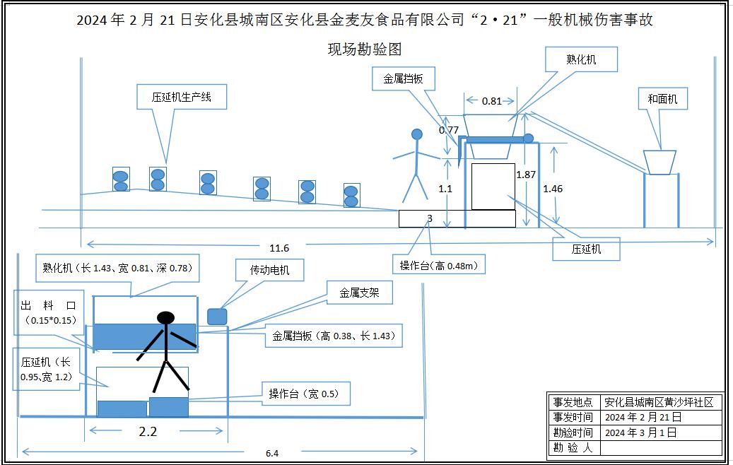 (四)事故现场勘验情况:事故发生地点位于面条生产车间熟化机料斗位置,生产车间长约11.6m、宽约6.4m,占地面积74.2㎡,设置有面条生产线(北侧)及馄饨皮生产线(南侧),面条生产线设置有和面机、熟化机、复合压延机三种机械设备。熟化机支架为角钢与槽钢焊制而成,支架高1.43m,长2.2m;支架上方架设有熟化机料斗,料斗长1.43m,宽0.81m,深度为0.78m,上沿离地1.87m,下方设置有一平台,平台宽0.5m,长0.9m,离地面0.487m。