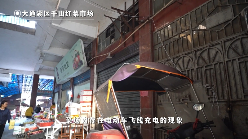大通湖区千山红菜市场:菜场内存在电动车飞线充电的现象。