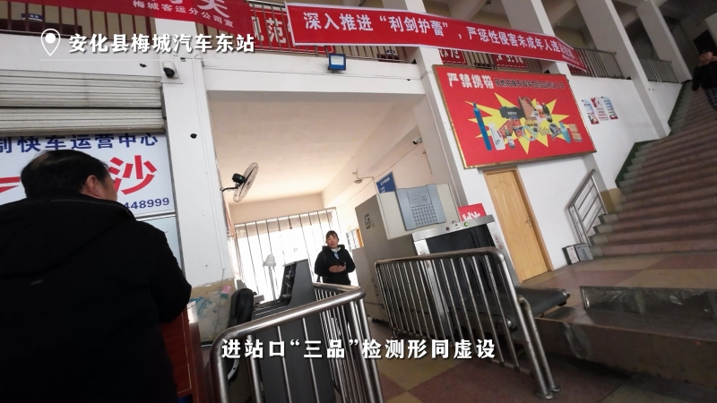安化县梅城汽车东站:进站口“三品”检测形同虚设,虽有工作人员值守,但安检机未开启。撬装式加油站与外墙的安全距离不够,未落实“三同时”。车站的管理人员在加油站旁随意吸烟。