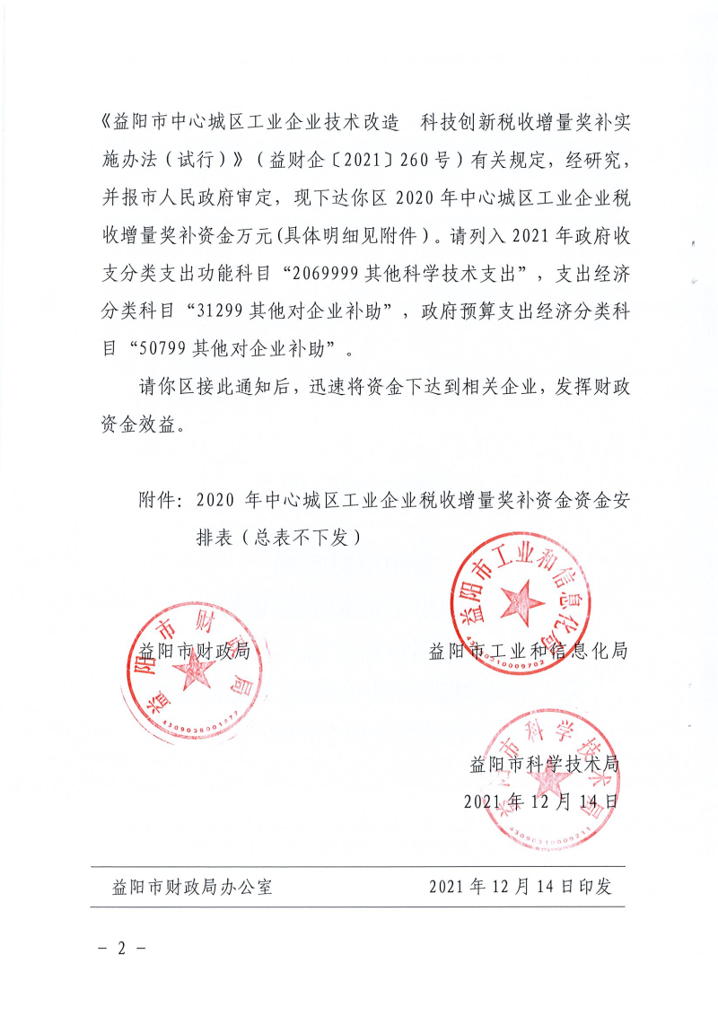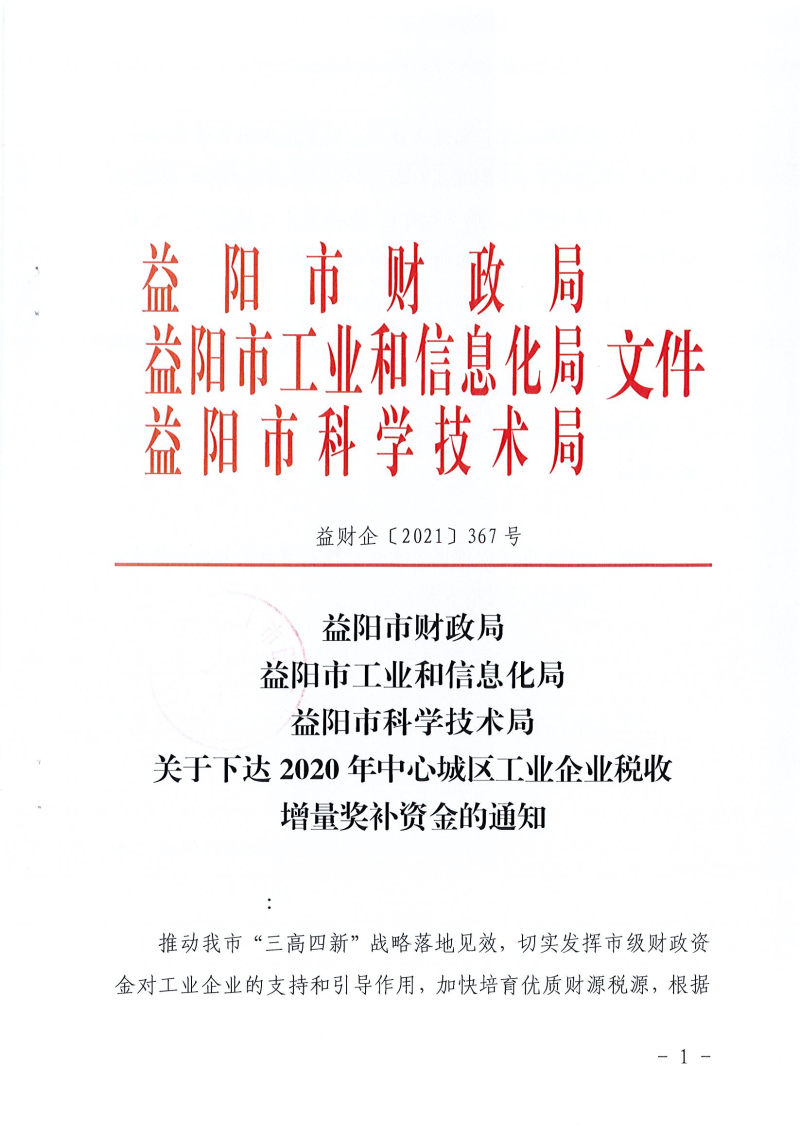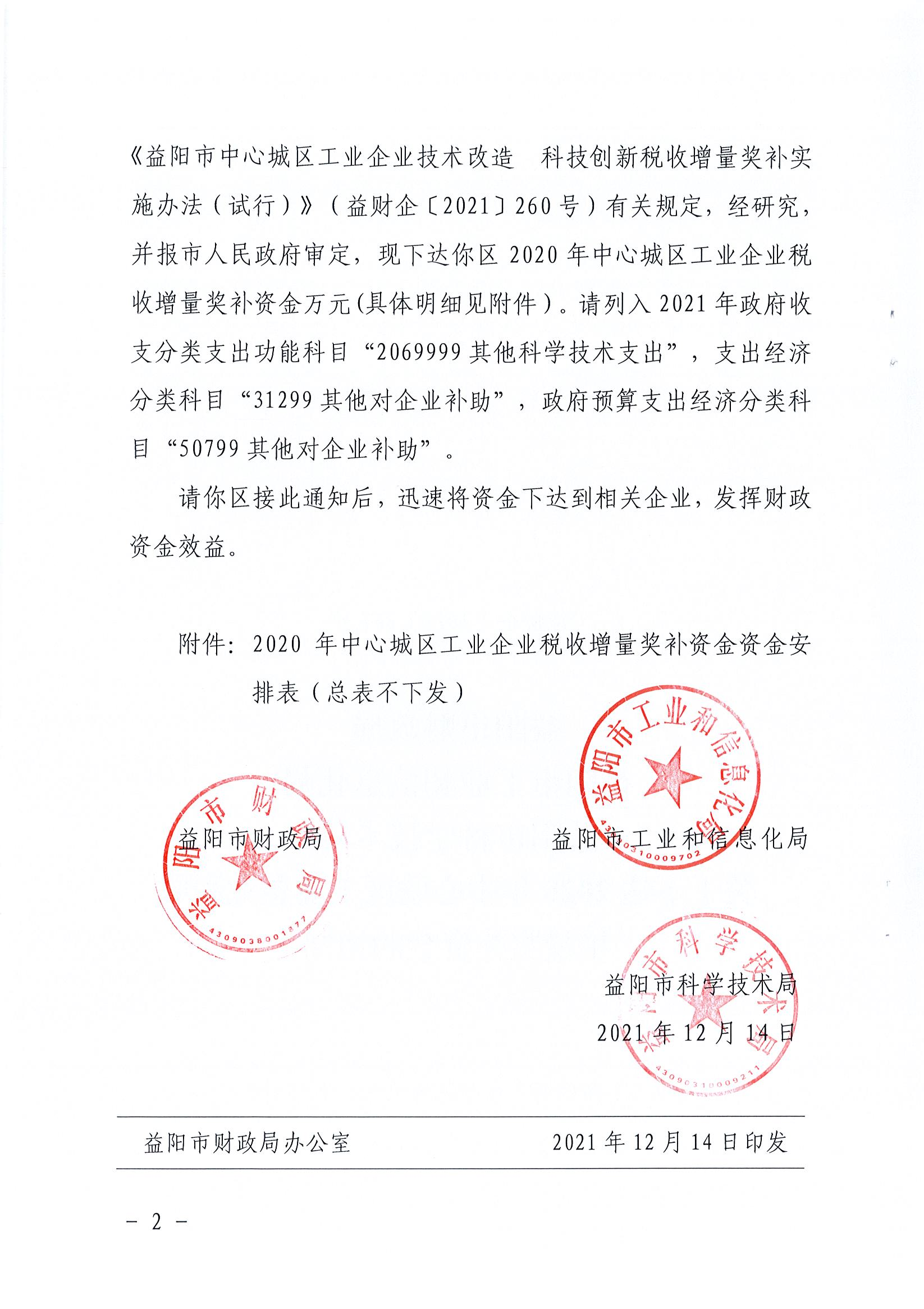 关于下达2020年中心城区工业企业税收增量奖补资金的通知