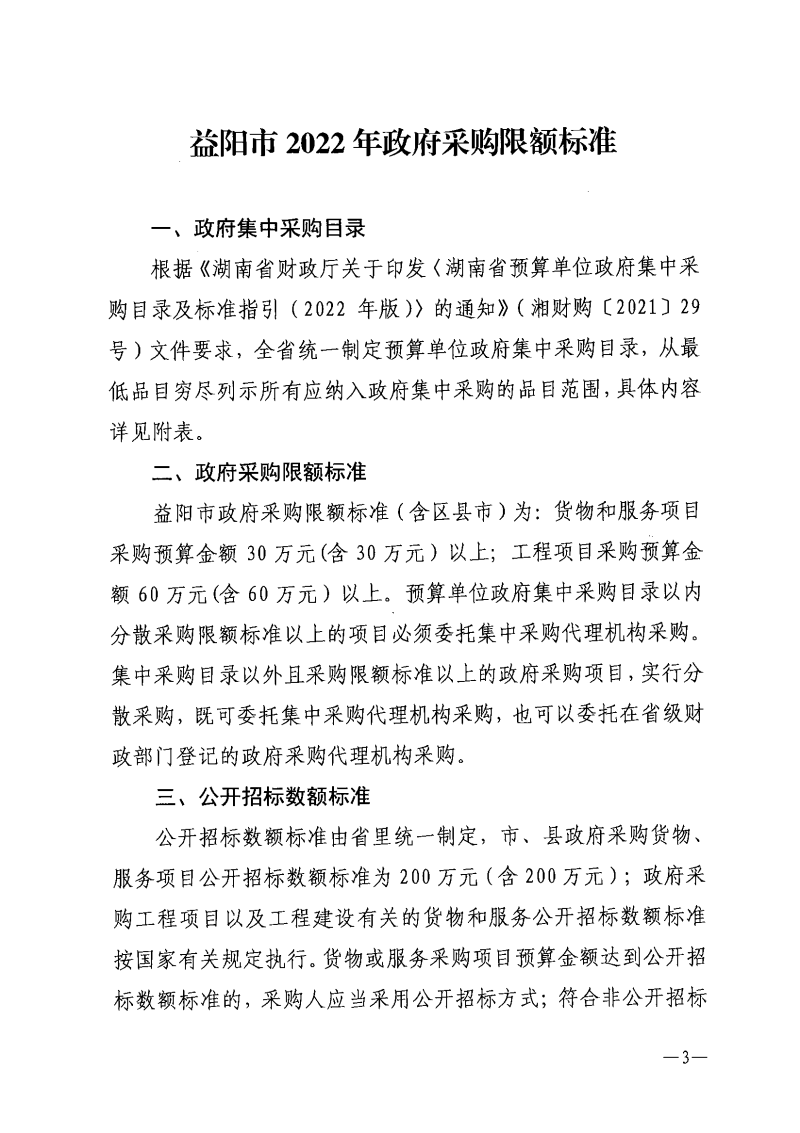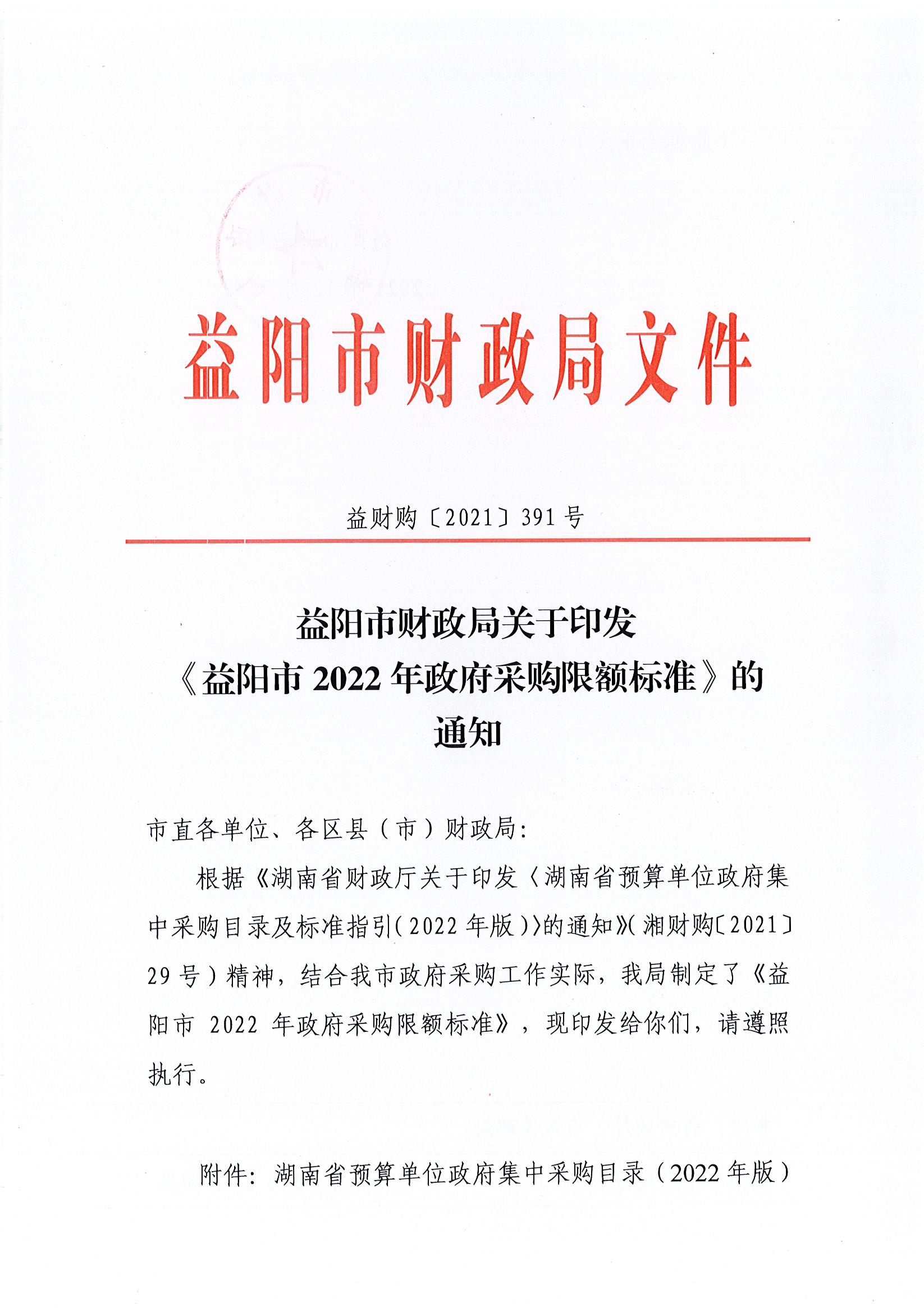 益阳市财政局关于印发《益阳市2022年政府采购限额标准》的通知
