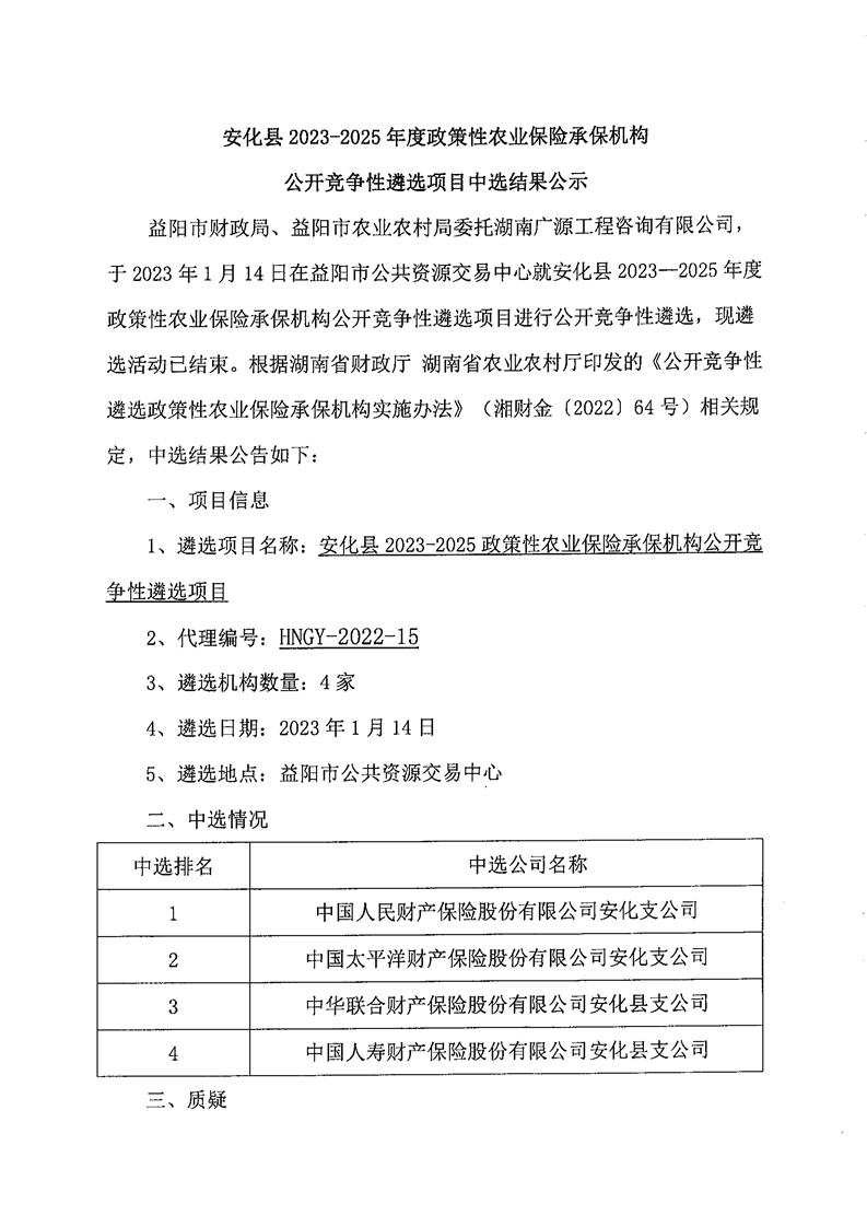 安化县2023-2025年度政策性农业保险承保机构公开竞争性遴选项目中选结果公示