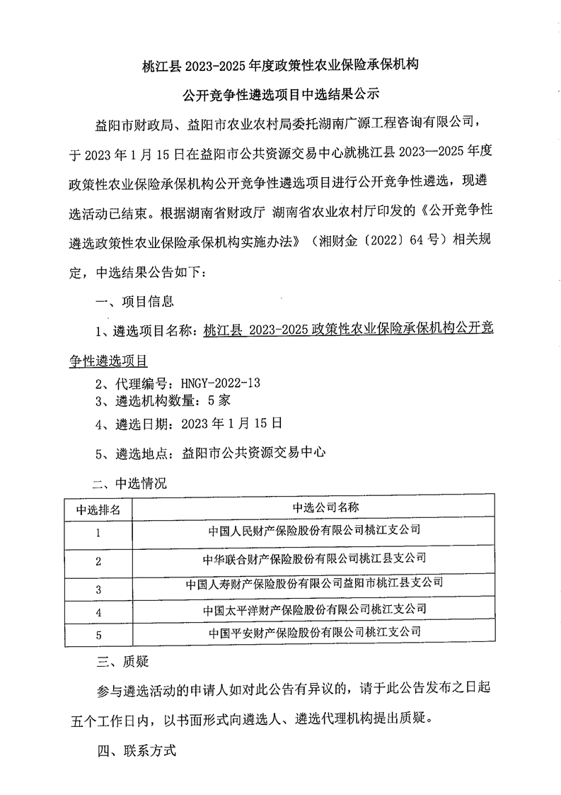 桃江县2023- 2025年度政策性农业保险承保机构公开竞争性遴选项目中选结果公示