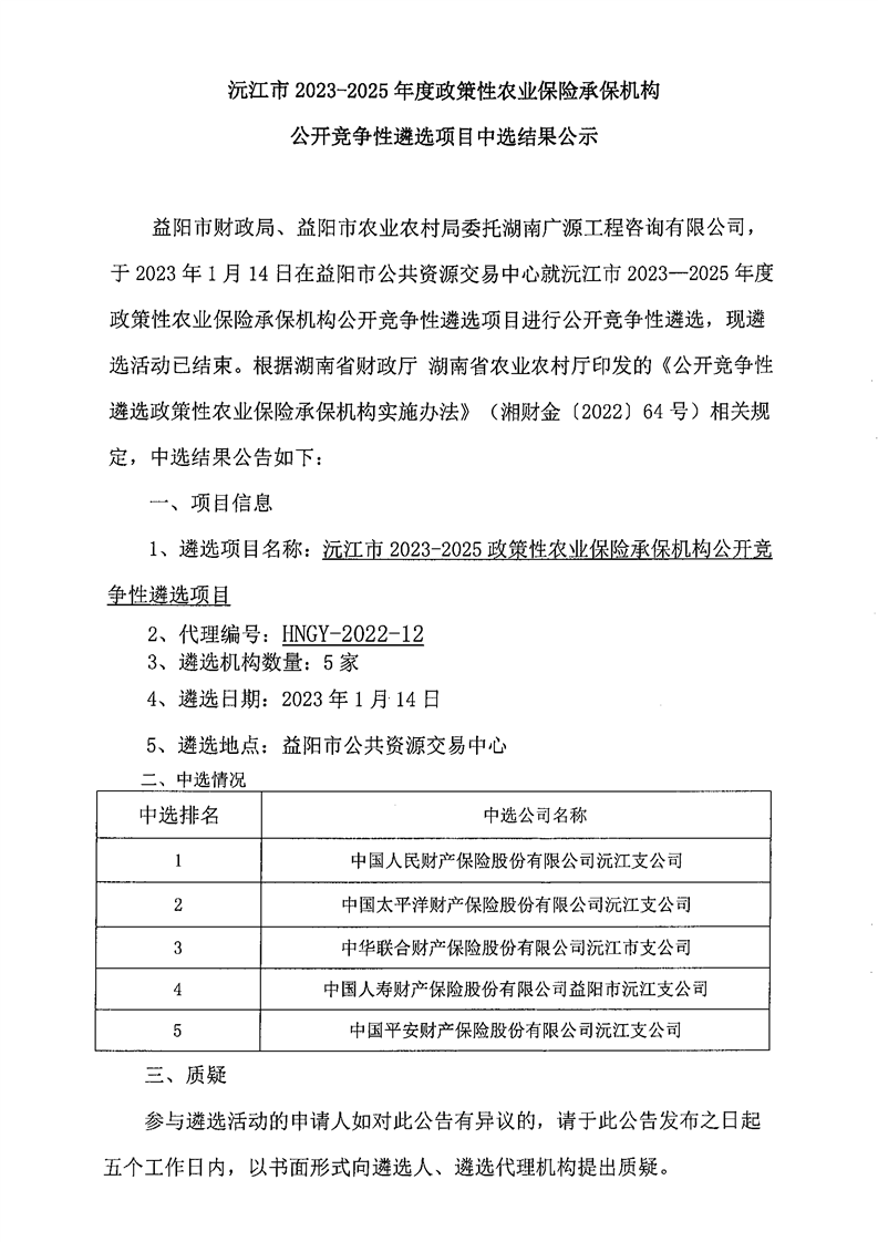 沅江市2023-2025年度政策性农业保险承保机构 公开竞争性遴选项目中选结果公示