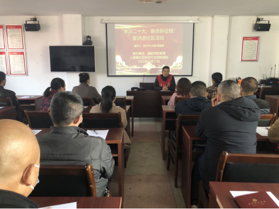 11月17日,市财政局党员志愿者在人民路社区新时代文明实践站开展“学习党的二十大精神,奋进新征程”宣讲进社区活动,支付中心支部书记禹金明为社区居民宣讲党的二十大精神。